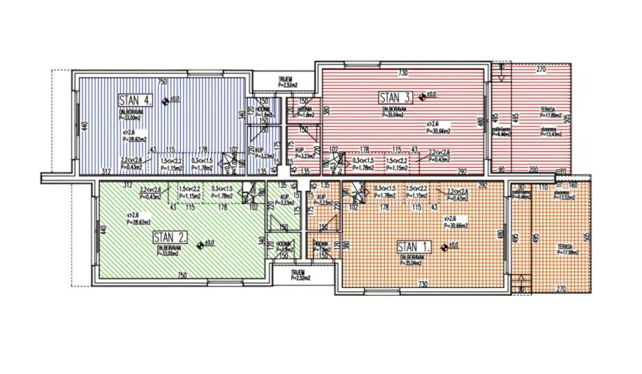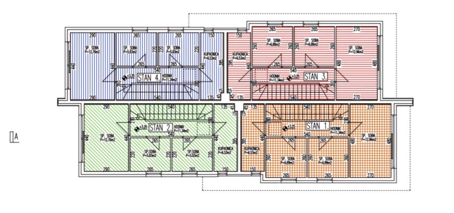 Sastoji se od: ulaznog prostora, dnevnog boravka, kuhinje, kupaonice i terase u prizemlju, a na katu se nalaze hodnik, tri spavaće sobei kupaonica.