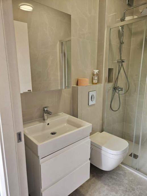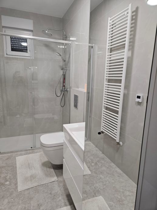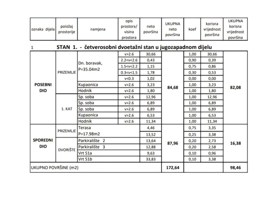 Pripada joj terasa od 17,98 m2, vrt površine 43,46 m2, te DVA PARKIRNA MJESTA površina 13,64 i i 12,88 m2.