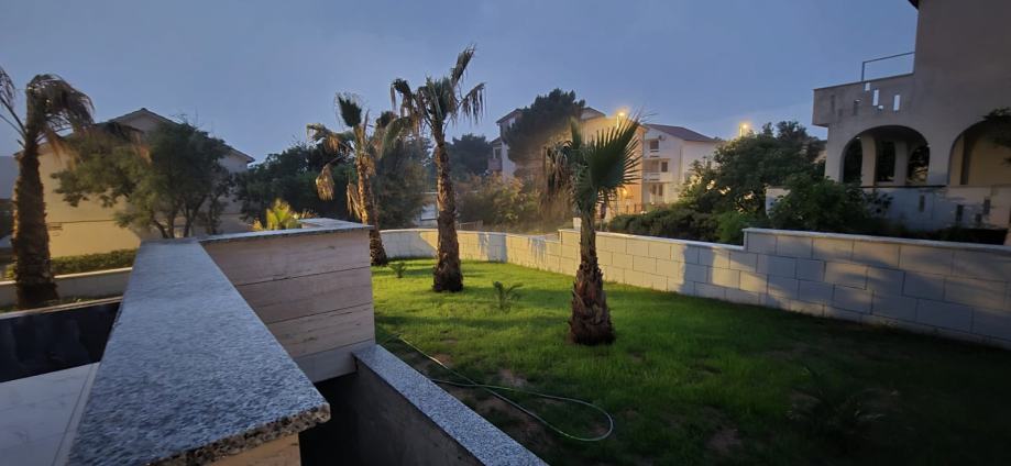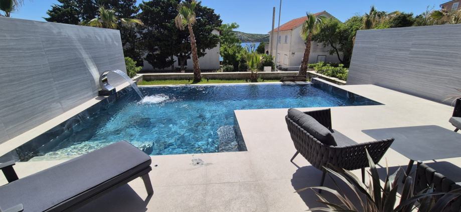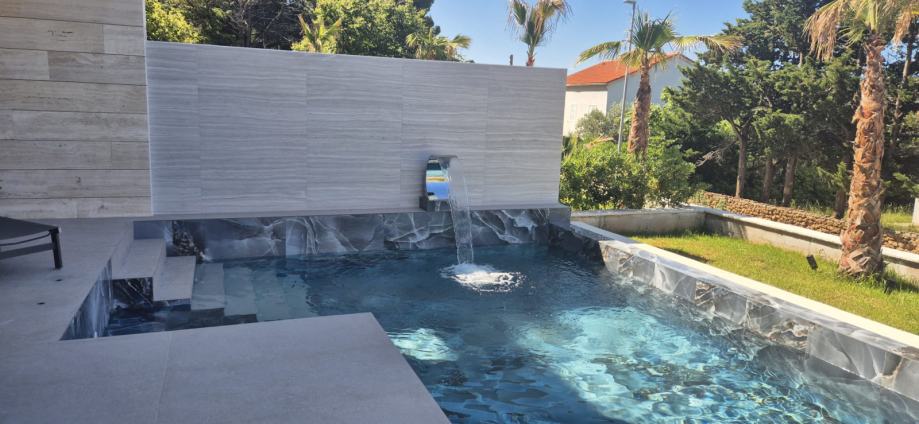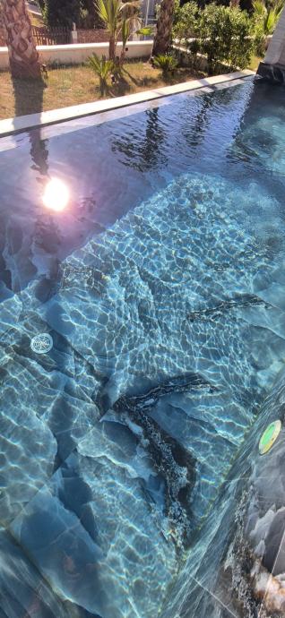 Prizemlja u kojem se nalazi lijepi prostrani dnevni boravak s kuhinjom i blagovaonicom, WC-om, praonicom. Iz dnevnog boravka se pruža lijep pogled na more i preljevni bazen dimenzija 10x5 m, koji dolazi kompletno opremljen i u funkciji s pripadajućom opremom, slapovima za masažu i rasvjetom koji stvaraju poseban ugođaj, posebno noću.