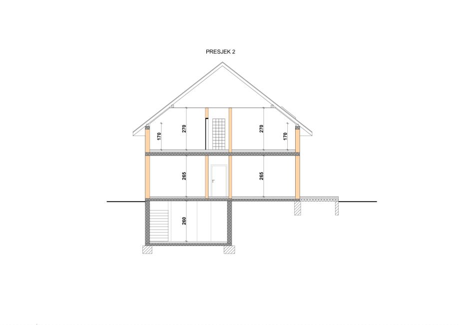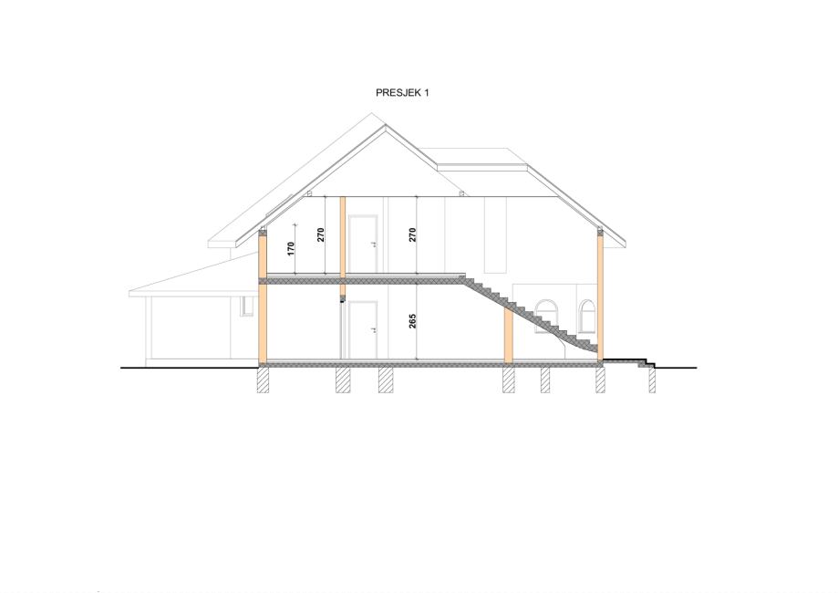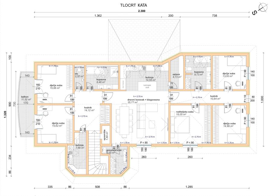 Kat je normalne visine s 5 soba, dnevnim boravkom, kuhinjom, dvije kupaone, garderobom i dodatnim prostorijama sve vidljivo na tlocrtu objekta.