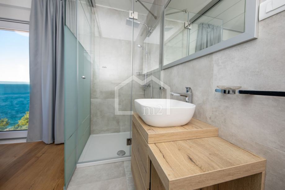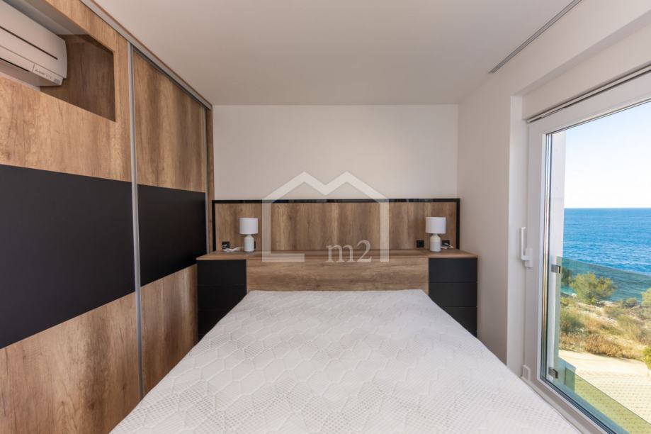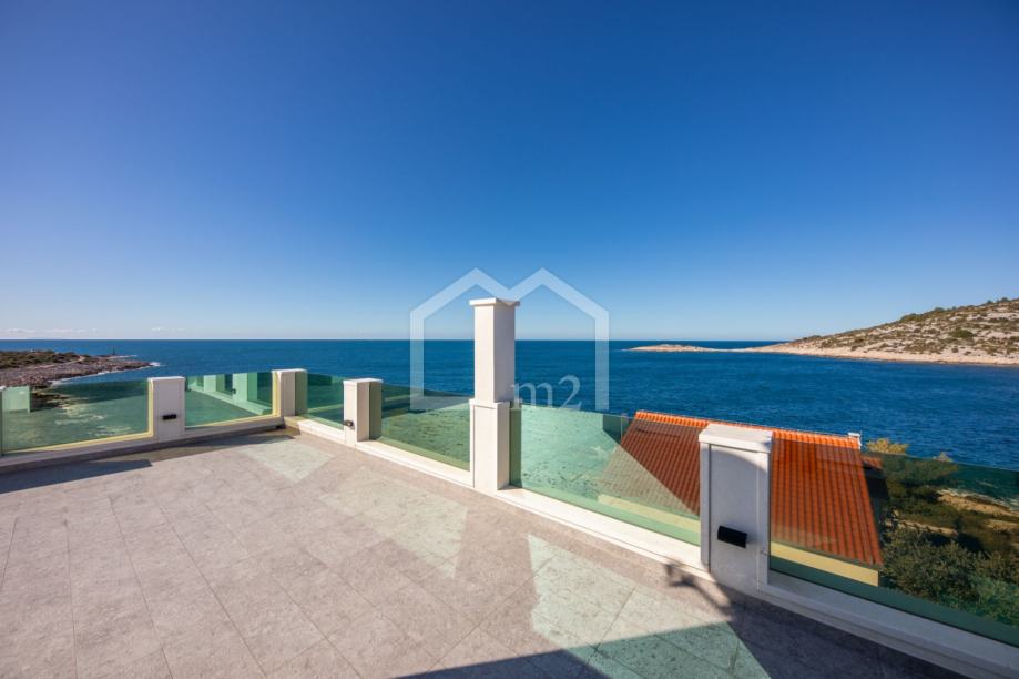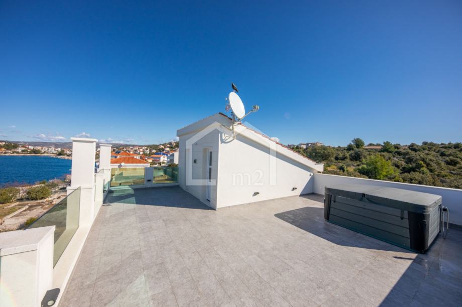 Posredujemo u prodaji luksuzne novogradnje u Uvali Stivašnica nedaleko od centra Rogoznice. Parcela ima površinu 390 m2, a kuća ima stambenu površinu od 300 m2. Sastoji se od podruma, prizemlja, prvog i drugog kata . U jednom dijelu prizemlja nalazi se garaža površine 20 m2 iz koje se ulazi direktno u kuću, strojarnica, tehnička soba, drugi dio čini kuhinja, kupaonica, soba, te velika prostorija koja je predviđena za kućno kino.Na prvom katu u razini vrta se nalazi dnevni boravak, kupaonica, te natkrivena terasa s bazenom površine 18 m2. Drugi kat čine tri spavaće sobe, svaka ima svoju kupaonicu. Na zadnjem katu je sauna s kupaonicom i krovna terasa površine 60 m2 na kojoj se nalazi jacuzzi. Sa svake etaže možete uživati u pogledu na otvoreno more. Do kuće vodi cesta, a u sklopu parcele osigurana su i parking mjesta. Svi sadržaji potrebni za život nalaze se na svega par kilometara udaljenosti. Plaža se nalazi na svega 30 m od kuće, a aerodrom je udaljen 30 km.