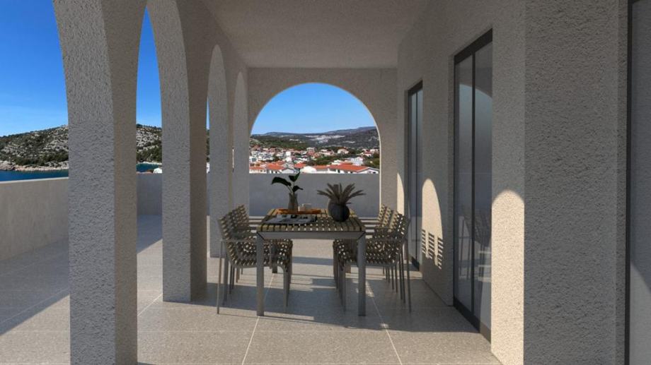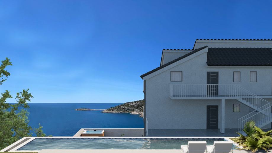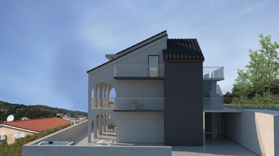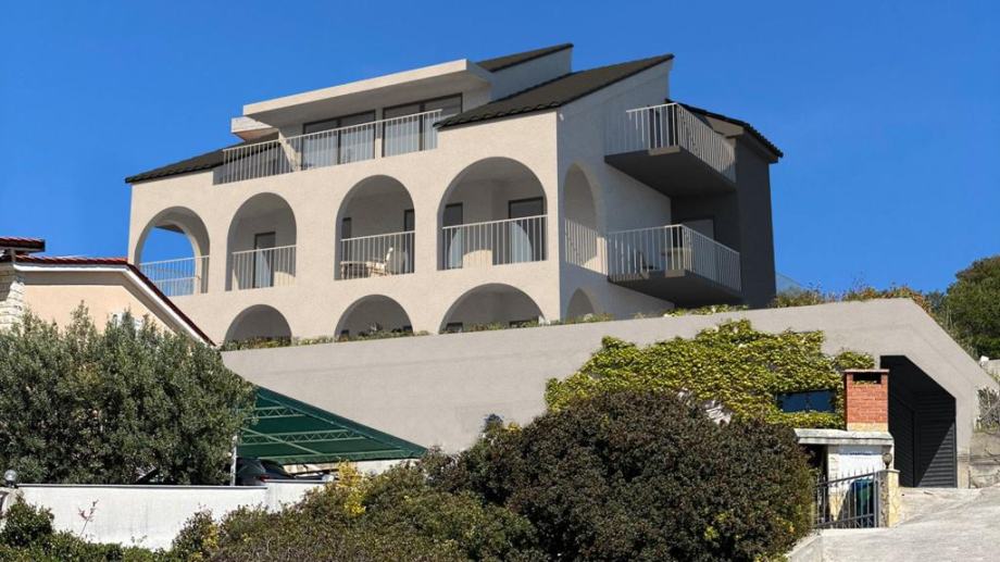 Uz dio garaže, nalazi se prostrana terasa sa pogledom na more te mogućnošću uređenja bazena i zajedničkog sunčališnog dijela.