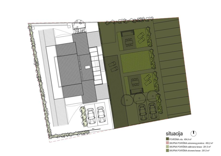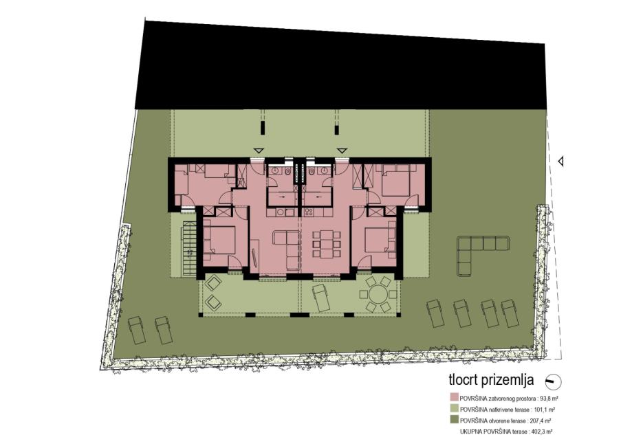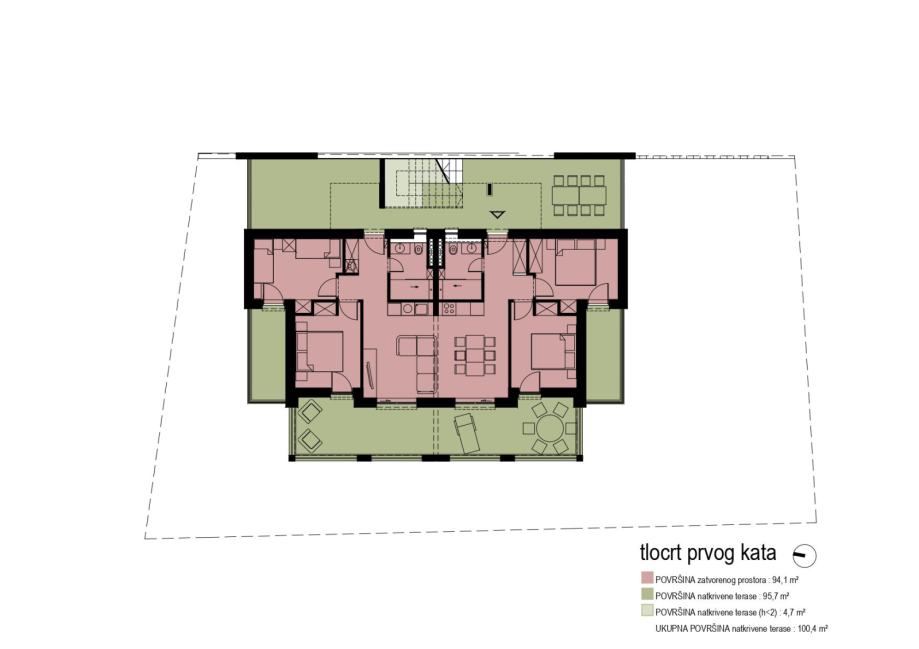 Prizemlje i prvi kat su koncipirani kao dva odvojena dvosobna stana (dva stana po svakoj etaži - površina svake etaže 100m2 stambenog prostora te dodatno terase koje su iznimno prostrane), sa zasebnim ulazima.