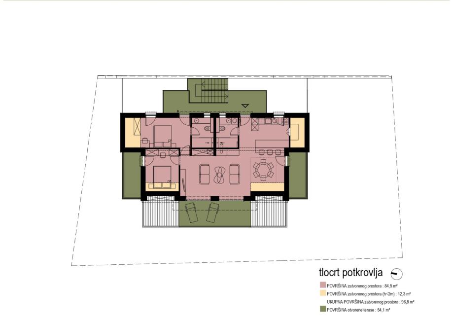 U potkrovlju se nalazi penthouse sa dvije spavaće sobe i dvije kupaonice, te prostranim dnevnim boravkom i kuhinjom.