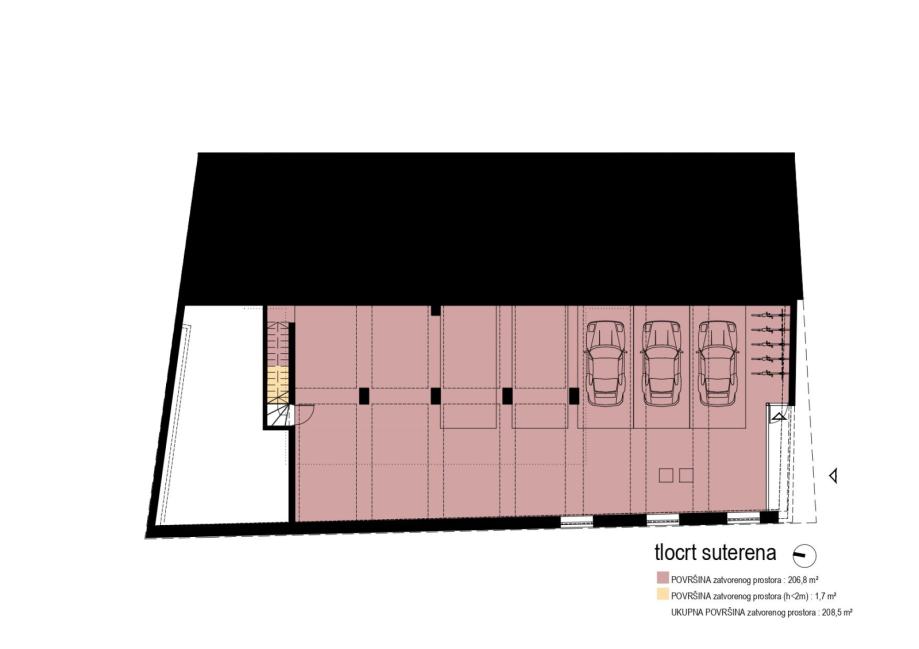 U suterenskom dijelu objekta, smješten je garažni prostor od 200m2 zatvorenog prostora, koji se može prenamijeniti i u wellness prostorije, te samim time podignuti vrijednost ville prilikom turističkog najma.