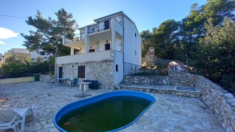 We are selling a detached house in Stomorska, in the Pelegrin area, third row from the sea. The plot size is 370 m². It is a beautiful location with an open view, situated in a very quiet environment next to a forested area (there is no possibility of construction nearby). The house consists of two large apartments with terraces and a studio apartment in the basement. The plot includes a small pool with a sunbathing area and a barbecue. The ownership is clear. The price is negotiable.
