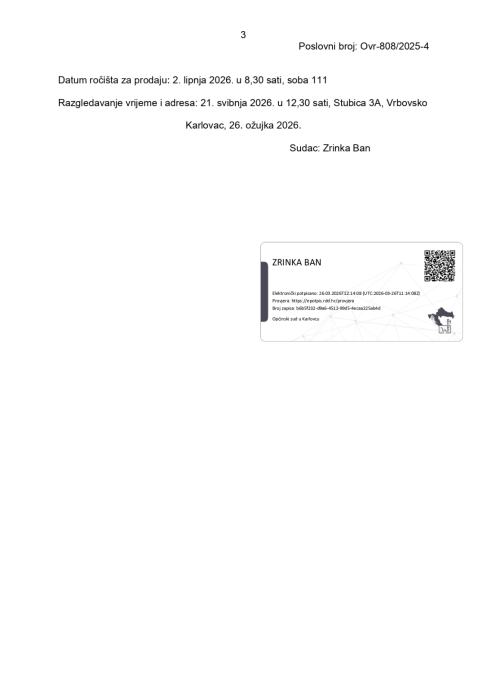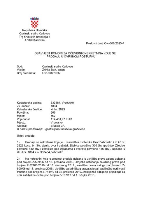 Prodaje se nekretnina koja je u vlasništvu ovršenika Grad Vrbovsko i to kč.br. 2823 kuća, br. 3A, sjenik, dvor i pašnjak Žljebice površine 366 čhv (pašnjak Žljebice površine 180 čhv i zemljište pod zgradama i dvorište površine 186 čhv), upisane u zk.ul.br. 1894 k.o. 333484, Vrbovsko.
