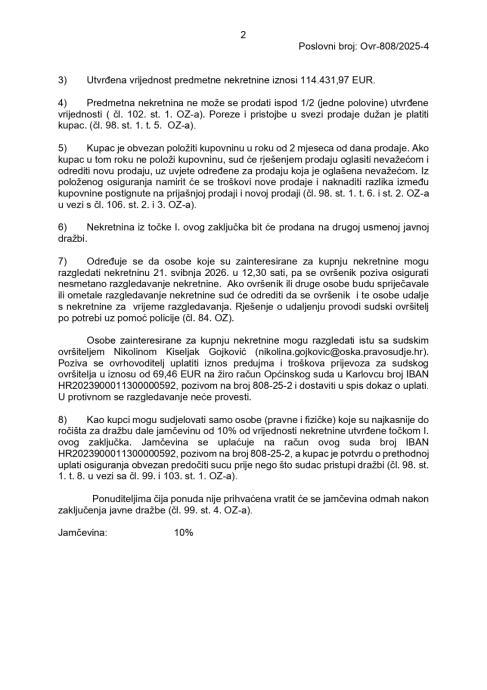 Određuje se da osobe koje su zainteresirane za kupnju nekretnine mogu razgledati nekretninu 21. svibnja 2026. u 12,30 sati, pa se ovršenik poziva osigurati nesmetano razgledavanje nekretnine. Ako ovršenik ili druge osobe budu spriječavale ili ometale razgledavanje nekretnine sud će odrediti da se ovršenik i te osobe udalje s nekretnine za vrijeme razgledavanja. Rješenje o udaljenju provodi sudski ovršitelj po potrebi uz pomoć policije (čl. 84. OZ).