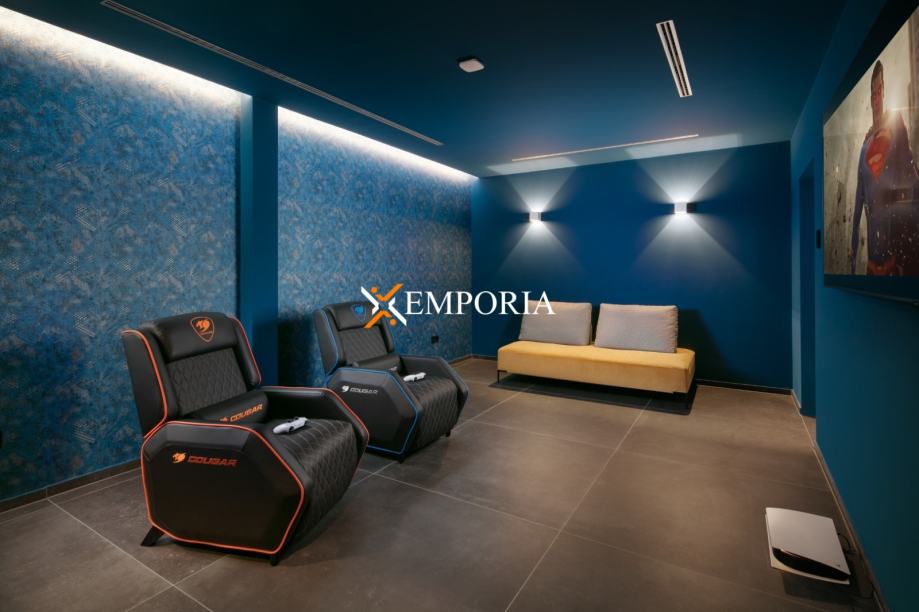 U podrumu (162,11 m²) nalazi se teretana, strojarnica, igraona (biljar, pikado, stolni nogomet, video igrice) i kućno kino, idealno za opuštanje i zabavu s obitelji i prijateljima. Prizemlje (284,43 m²) uključuje hodnik, kuhinju s blagovaonicom i dnevnim boravkom, WC te nenatkrivenu terasu. Na prvom katu (206,66 m²) smješteni su hodnik, dvije luksuzne spavaće sobe s vlastitim kupaonicama, dvije natkrivene terase, wellness prostor, sauna i unutarnji bazen (47,97 m²) koji se proteže prema vanjskoj terasi i može se potpuno zatvoriti staklom. Drugi kat (151,87 m²) uključuje hodnik, četiri prostrane spavaće sobe, svaka s vlastitom kupaonicom, te natkrivenu terasu s koje se pruža nevjerojatan pogled na more.