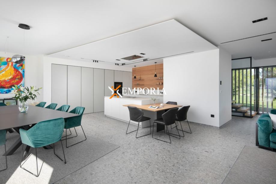 Ova luksuzna vila opremljena je visokokvalitetnim dizajnerskim namještajem, a svi uređaji i aparati (perilice, sušilice, pećnice, nape, hladnjaci, aparati za kavu) dolaze od najboljih proizvođača. Kuća je opremljena pametnim sustavom za upravljanje, a svi prostori su klimatizirani. Grijanje je podno električno, a prozori su aluminijski s troslojnim staklom i električnim roletama, što osigurava visoku energetsku učinkovitost i udobnost u svim uvjetima.