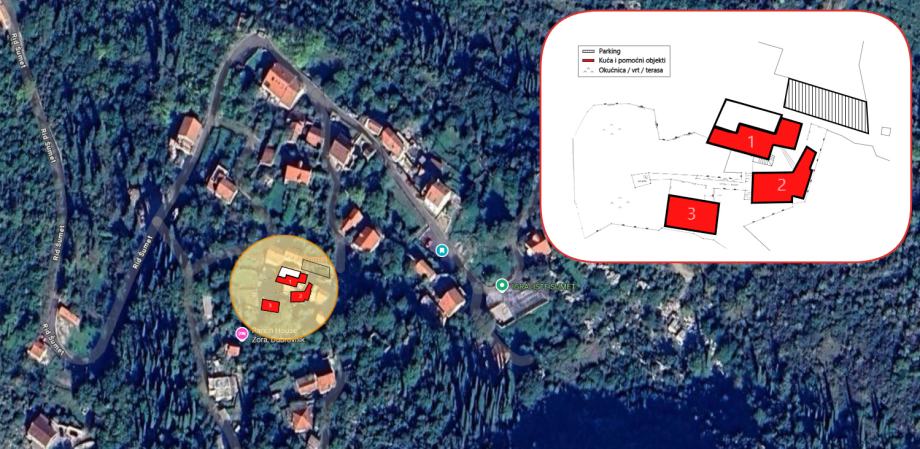 Zemljište je kvadrature oko 850 m² sa polugrađenim objektima (stambeno uređena kuća i dva objekta koji se koriste kao pomoćni a stambene su namjene). Zemljište je kompletno ograđeno i uređeno.