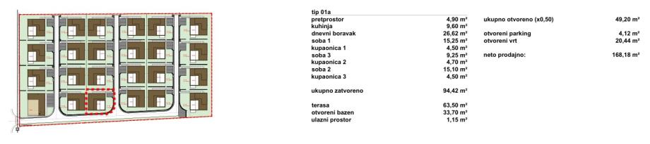 Vile su projektirane kao dva tipa katnosti. Vila katnosti prizemlje naziva se Tranquillo (ukupno 12), a vila katnosti prizemlje + kat naziva se Piano (ukupno 11). Sve vile imaju natkrivene i nenatkrivene terase sa bazenom i po dva parkirna mjesta.