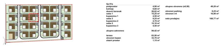 Vile su projektirane kao dva tipa katnosti. Vila katnosti prizemlje naziva se Tranquillo (ukupno 12), a vila katnosti prizemlje + kat naziva se Piano (ukupno 11). Sve vile imaju natkrivene i nenatkrivene terase sa bazenom i po dva parkirna mjesta.