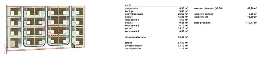 Vile su projektirane kao dva tipa katnosti. Vila katnosti prizemlje naziva se Tranquillo (ukupno 12), a vila katnosti prizemlje + kat naziva se Piano (ukupno 11). Sve vile imaju natkrivene i nenatkrivene terase sa bazenom i po dva parkirna mjesta.