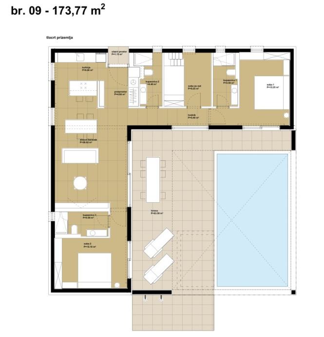 Villa Piano građevina, prizemlje + kat, sastoji se od četiri spavaće sobe, vlastitog vanjskog prostora bazena (40 m2) te pripadajućeg prostora terase i vrta. Uz ulaz u vilu smješta se ulazni predprostor na koji se nastavljaju prostori sanitarija i spremišta. Na ulaz se nadovezuje i kuhinja sa blagovaonicom te veliki dnevni boravak, otvoren prema terasi. U prizemlju smještene su i dvije spavaće sobe s kupaonicom. Na katu su smještene još dvije spavaće sobe svaka sa svojom pripadajućom kupaonicom i svojim izlaz na terasu, a jedna od soba ima i vlastitu garderobu.