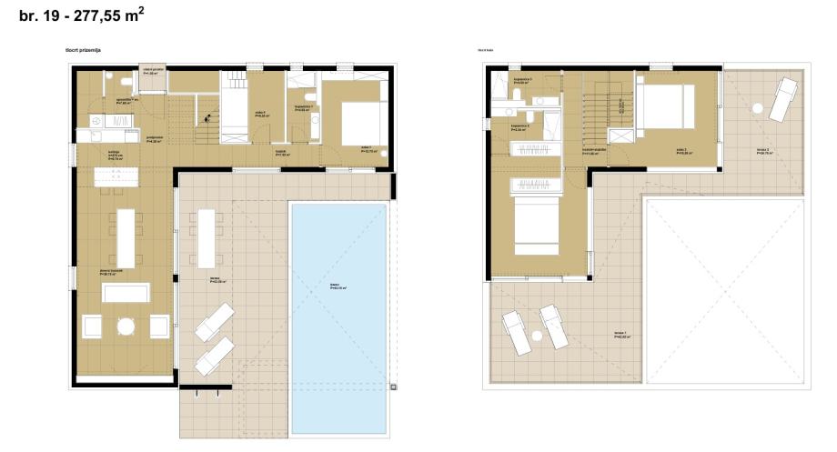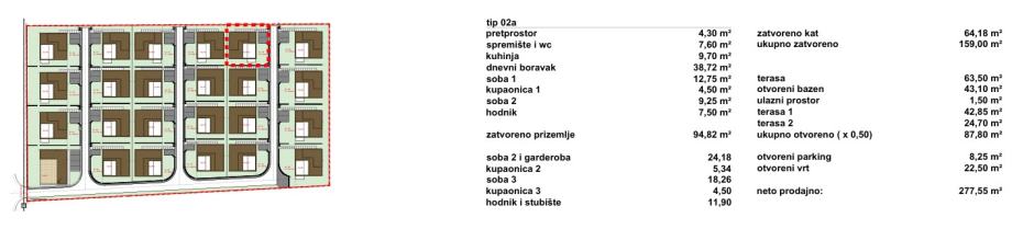 Vile su projektirane kao dva tipa katnosti. Vila katnosti prizemlje naziva se Tranquillo (ukupno 12), a vila katnosti prizemlje + kat naziva se Piano (ukupno 11). Sve vile imaju natkrivene i nenatkrivene terase sa bazenom i po dva parkirna mjesta.
