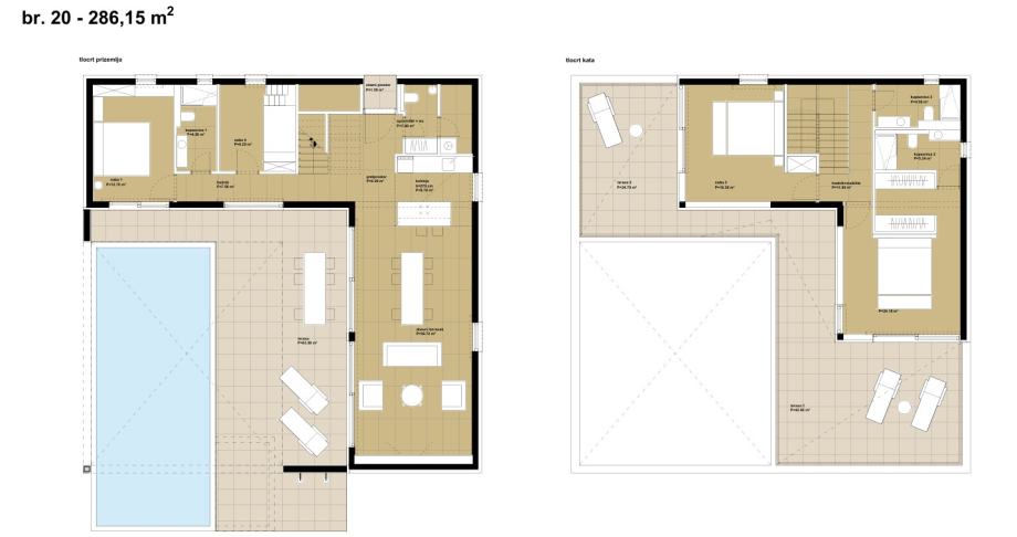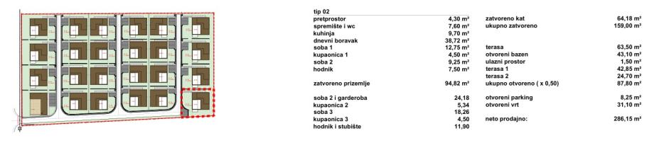 Vile su projektirane kao dva tipa katnosti. Vila katnosti prizemlje naziva se Tranquillo (ukupno 12), a vila katnosti prizemlje + kat naziva se Piano (ukupno 11). Sve vile imaju natkrivene i nenatkrivene terase sa bazenom i po dva parkirna mjesta.