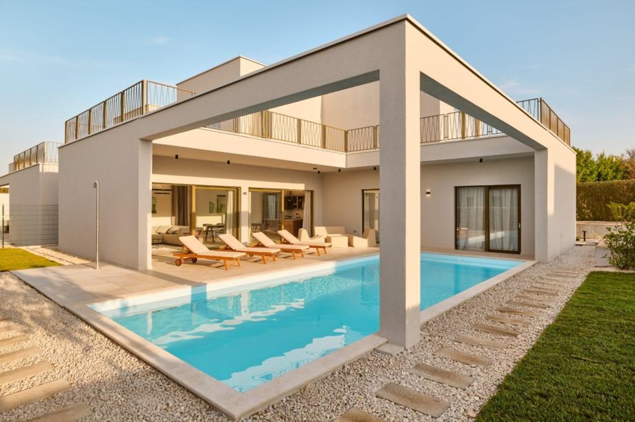 Vile su izvedene u modernoj arhitekturi od armiranog betona sa podnom pločom i temeljnim trakama te s velikim staklenim stijenama, prostranim otvorenim prostorima i vrhunskim namještajem. Vanjska ALU stolarija opremljena je prvoklasnim Wicona profilom, a ostakljenje ima najveći dopušteni koeficijent prolaska topline od 0,7 W/m2K. Međuprostor takvih stakala je ispunjen inertnim plinom (argon). Krov je izveden kao ravni i izoliran prvoklasnom hidroizolacijom (TPO membrana), parnom branom i toplinskom izolacijom debljine 12 cm. Na krovu svake vile postavljena je solarna elektrana Huawei.