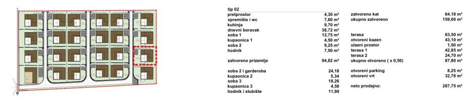 Vile su projektirane kao dva tipa katnosti. Vila katnosti prizemlje naziva se Tranquillo (ukupno 12), a vila katnosti prizemlje + kat naziva se Piano (ukupno 11). Sve vile imaju natkrivene i nenatkrivene terase sa bazenom i po dva parkirna mjesta.