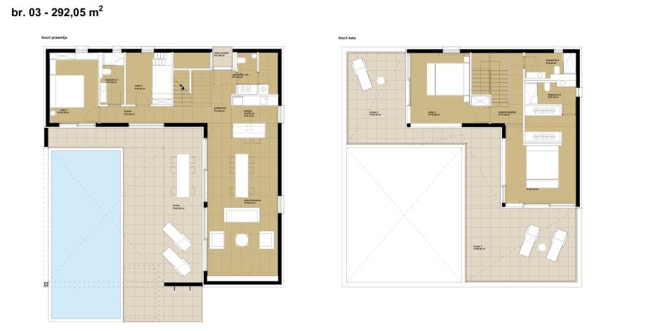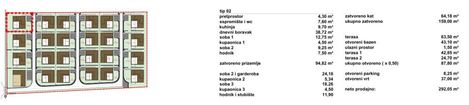 Vile su projektirane kao dva tipa katnosti. Vila katnosti prizemlje naziva se Tranquillo (ukupno 12), a vila katnosti prizemlje + kat naziva se Piano (ukupno 11). Sve vile imaju natkrivene i nenatkrivene terase sa bazenom i po dva parkirna mjesta.