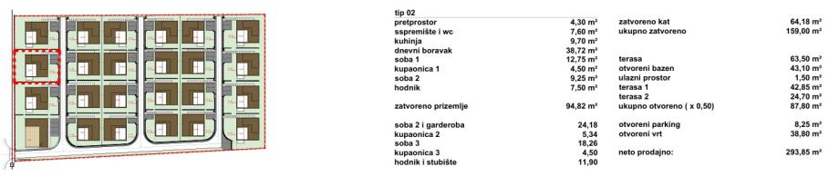 Vile su projektirane kao dva tipa katnosti. Vila katnosti prizemlje naziva se Tranquillo (ukupno 12), a vila katnosti prizemlje + kat naziva se Piano (ukupno 11). Sve vile imaju natkrivene i nenatkrivene terase sa bazenom i po dva parkirna mjesta.