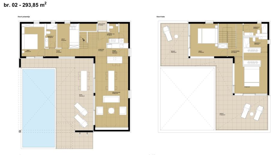 Villa Piano građevina, prizemlje + kat, sastoji se od četiri spavaće sobe, vlastitog vanjskog prostora bazena (40 m2) te pripadajućeg prostora terase i vrta. Uz ulaz u vilu smješta se ulazni predprostor na koji se nastavljaju prostori sanitarija i spremišta. Na ulaz se nadovezuje i kuhinja sa blagovaonicom te veliki dnevni boravak, otvoren prema terasi. U prizemlju smještene su i dvije spavaće sobe s kupaonicom. Na katu su smještene još dvije spavaće sobe svaka sa svojom pripadajućom kupaonicom i svojim izlaz na terasu, a jedna od soba ima i vlastitu garderobu.