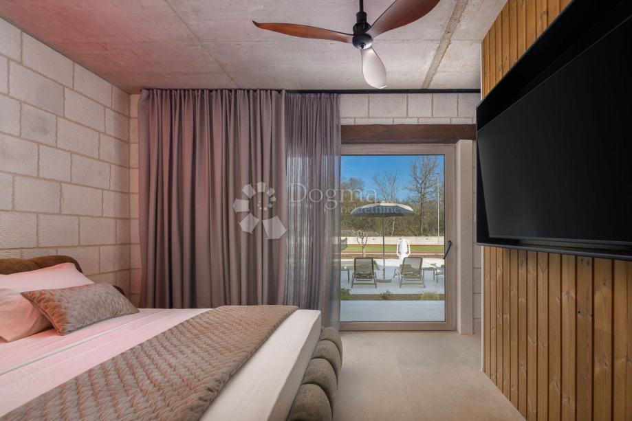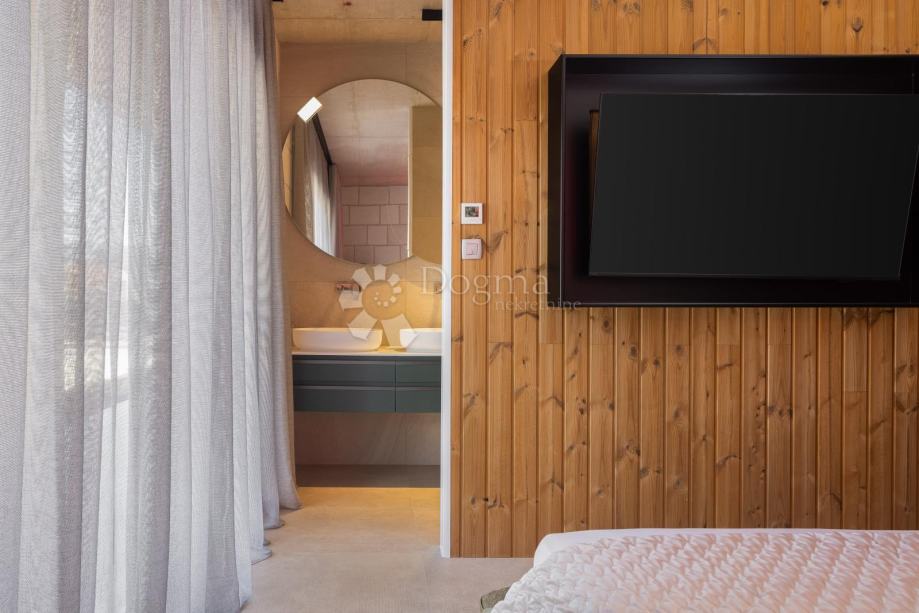 Vila ima i četiri spavaće sobe s vlastitim kupaonicama i izlazom na veliku natkrivenu terasu od 250 m², obloženu prirodnim kamenom, gdje se nalazi grijani bazen od 45 m² s ležaljkama za sunčanje., vanjski tuš sa toplom vodom kao i zasrban wc.