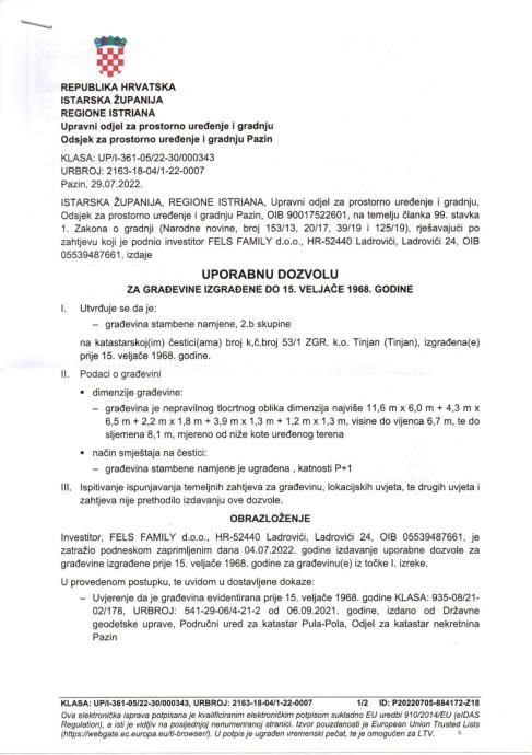 Prodaje se stara kamena kuća (dvije kuće), u samom centru gradića Tinjan. Riječ je o jedinstvenoj građevini koju je potrebno renovirati. Prijedlog idejnog rješenja u prilogu, s dvije kuće i bazenom. Zidovi i statika su dobri, potrebno učiniti unutarnje radove, krovište i bazen. Procjena gotovog stanja (dvije kuće i bazen) od 800.000. - 1.200.000 eura. Uporabnu dozvolu ne treba iskoditi jer je objekt napravljen prije 1968. godine (rješenje u prilogu). Ovaj biser u predivnom istarskom ambijentu je odlična destinacija za odmor kao i prilika za najam / prodaju. Prodaje vlasnik. Nekretnina je na firmi, cijena 355.000 eura + PDV. NOVO!!!! - Moguća kupovina "ključ u ruke" u dogovoru s građevinskom tvrtkom.