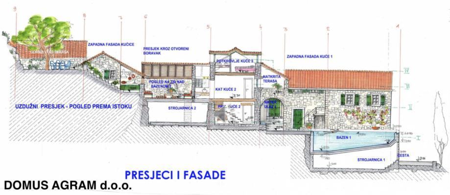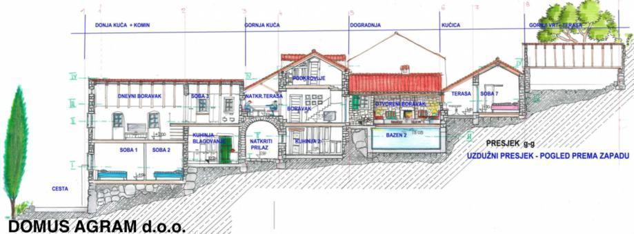 3 dvokrevetne sobe sa 3 pripadne kupaonice, zajednički dnevni boravak, kuhinja, odvojena blagovaonica, natkrivena terasa sa kamenom klupom i kamenim stolom (postojeće), terasa, otvoreni natkriveni boravak sa kaminom, bazen.