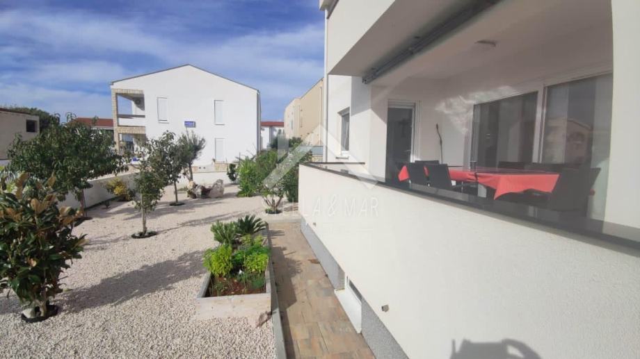 U prizemlju kuće je smješten veliki trosoban stan , sa dvije kupaonice , dnevnim dijelom sa kuhinjom i blagovaonicom iz kojih se izlazi na veliku natkrivenu terasu .