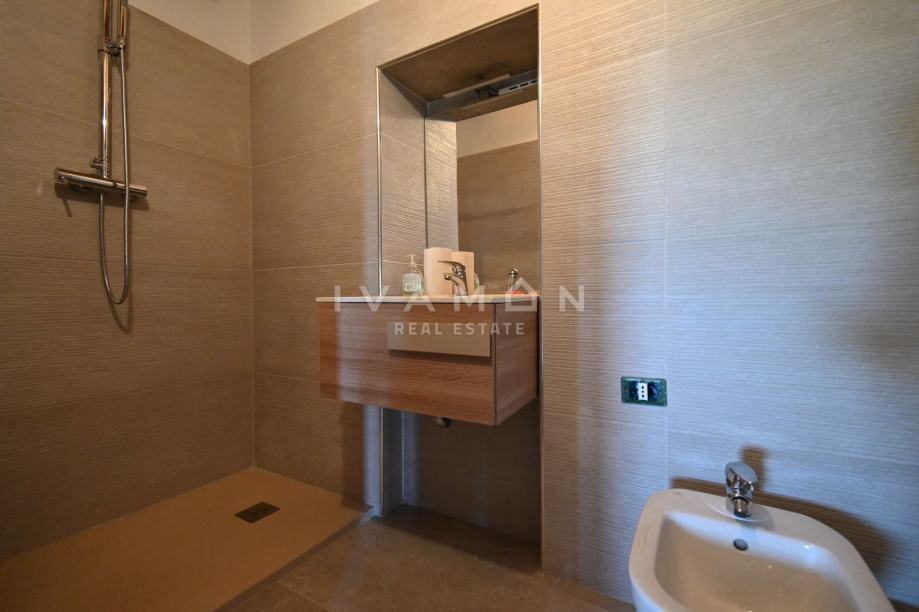 Na prvome katu se s jedne strane dolazi u još jedan jednosobni stan, a s drugog stubišta se dolazi u dvoetažni stan s 4 spavaće sobe, dvije kupaonice i velikom terasom s prekrasnim pogledom na more.