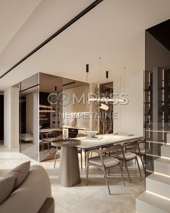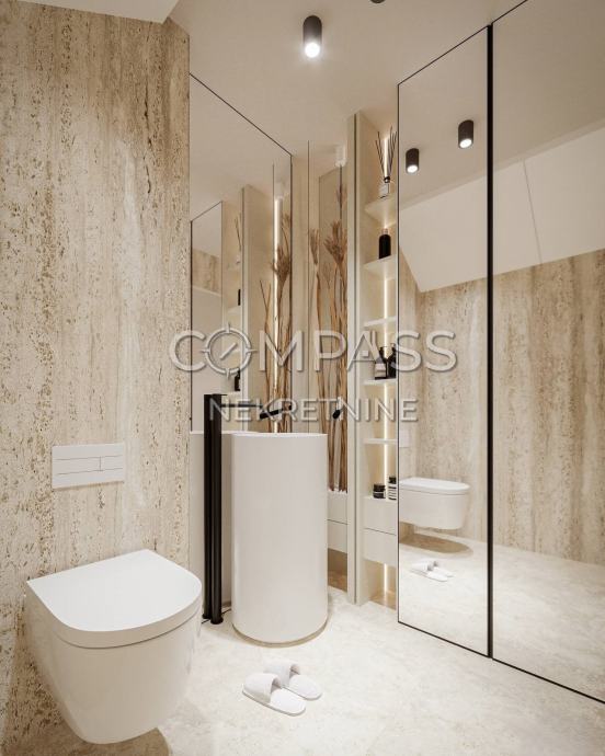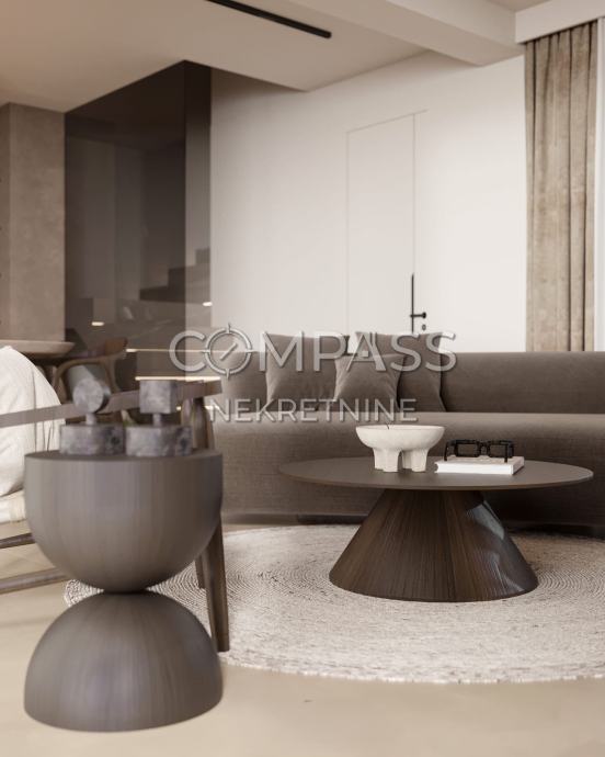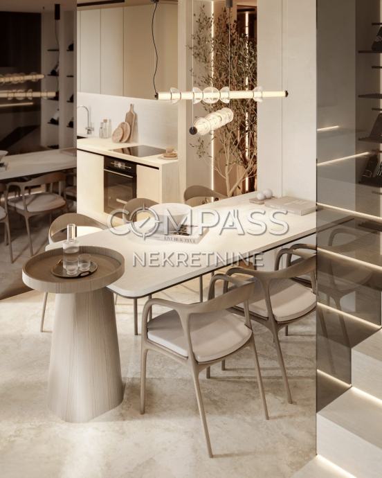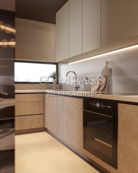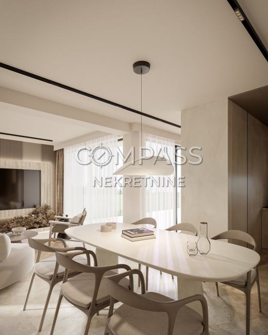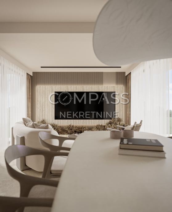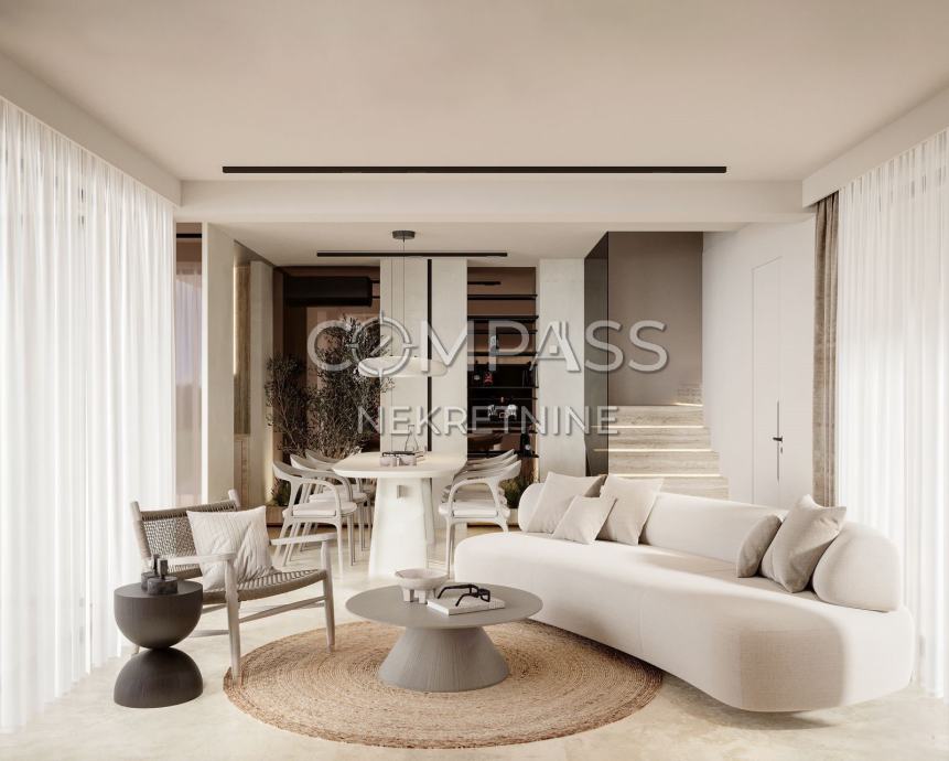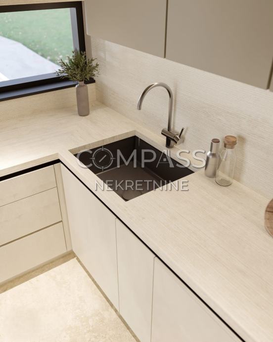 Prostrana kuhinja i blagovaonica s dodatnim WC-om, povezana s velikim dnevnim boravkom koji izlazi na dvije vanjske terase na suprotnim stranama. Na južnoj strani nalazi se privatni bazen s kompletnom pripremom za grijanje, sunčalište, prostor za roštilj i popločeni vrt uređen mediteranskim biljkama.