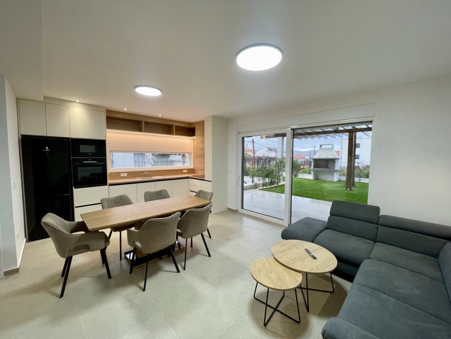 U prizemlju se nalazi kupaonica te prostrani dnevni boravak povezan s kuhinjom u open space konceptu, s izravnim izlazom u privatni vrt, gdje se nalazi roštilj zona, idealna za opuštanje i druženje na otvorenom.