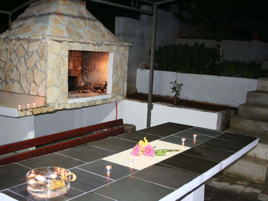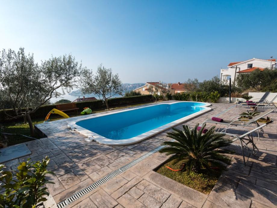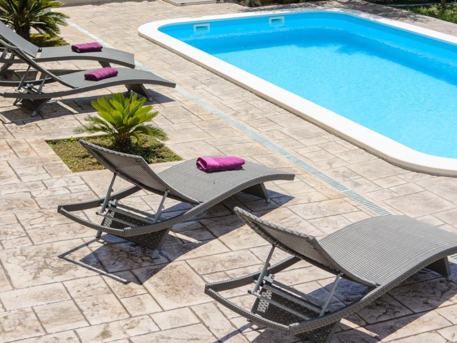 Kuća ima 4 parkirna mjesta, bazen 30m2 vanjski tuš, 15m2 terase s velikim vrtnim kaučem, vanjski roštilj sa stolom za 10 osoba prekrivenih sjenom.