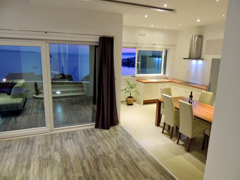 Mali dvosobni stan, 16m2 kuhinja i dnevni boravak, 8 m2 male sobe, 11m2 druga soba, 4 m2 kupaonica, hodnik 3m2 koji uključuje perilicu rublja. Podrum ima pristup 16m2 natkrivenoj terasi i pogledom na more.