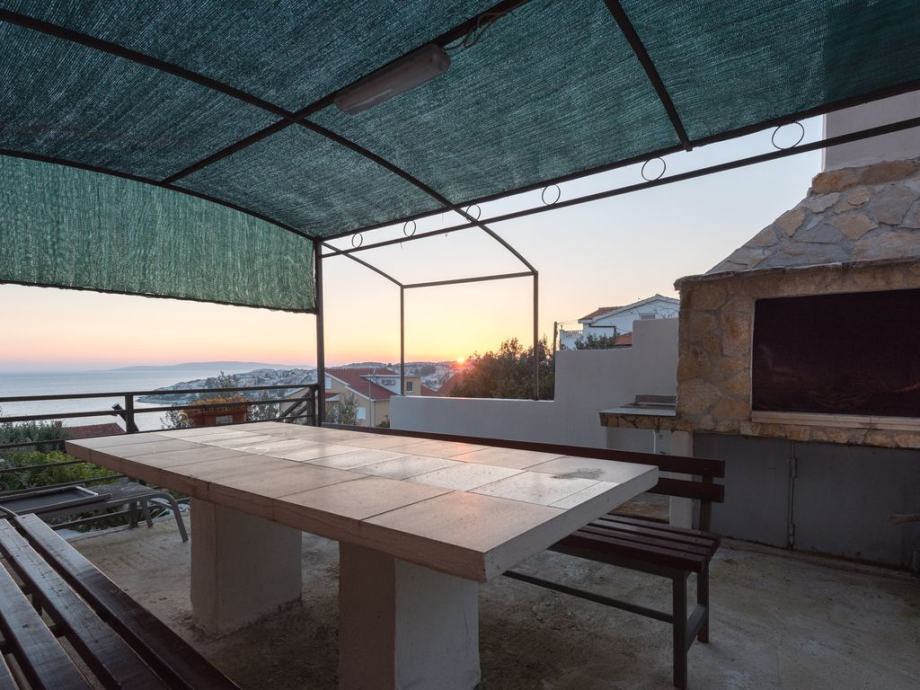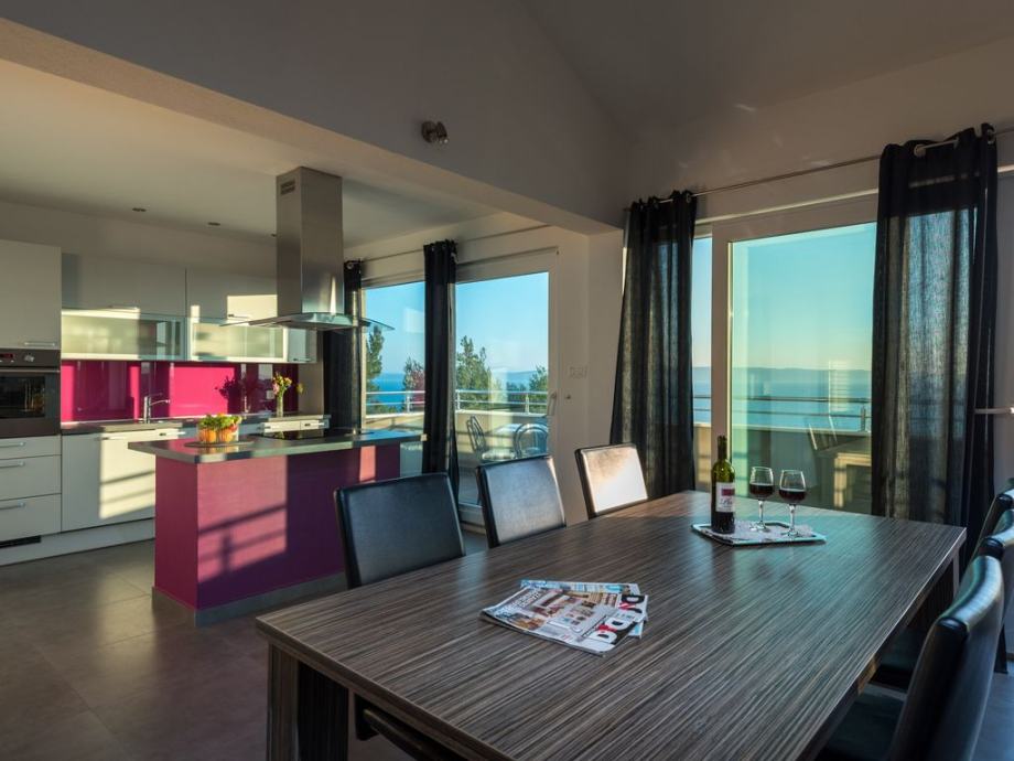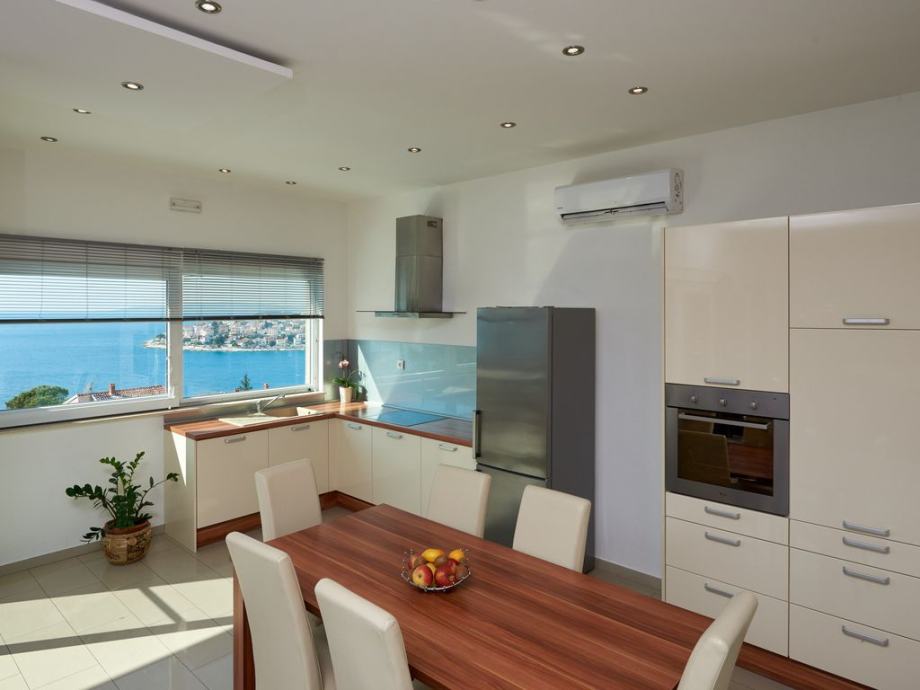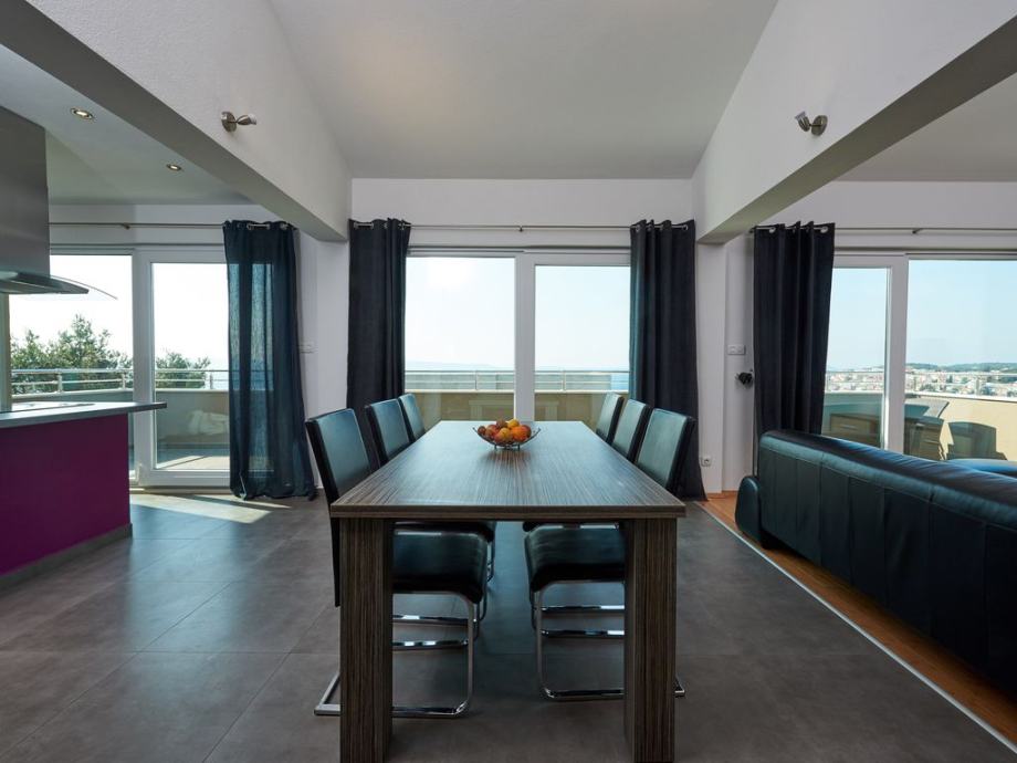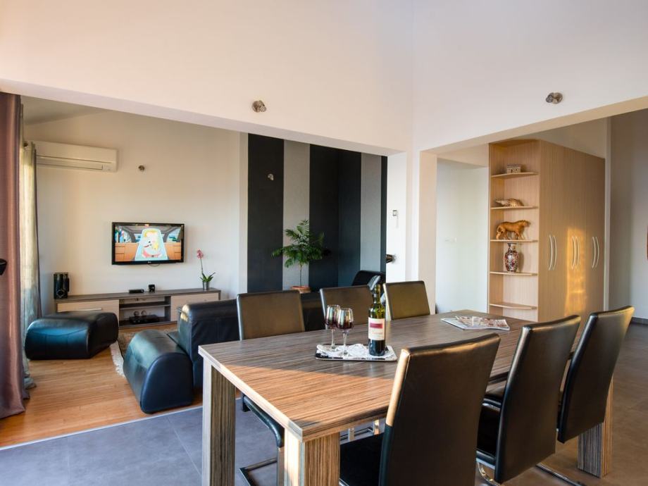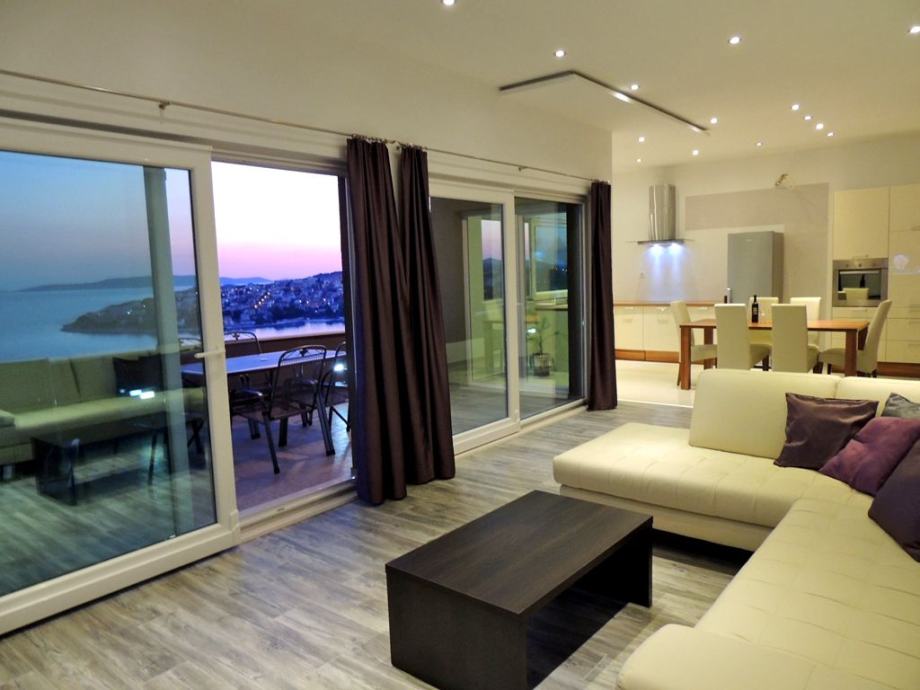 3 -sobni apartman 130 m2 na 2. katu, prema jugu, komforno i udobno uređen: dnevni boravak / blagovaona 60 m2 s 1 kaučem i TV-om sa sat. Prijemnikom, klima uređajem. Izlaz na balkon. 1 soba s 1 bračnim krevetom (2 x 80 cm, duljina 200 cm), kupatilo / WC i klima uređaj. Izlaz na balkon. 1 soba s 1 bračnim krevetom (2 x 80 cm, duljina 200 cm), kupatilo / WC, whirlpool, s kutnom kadom i klima uređajem. Otvorena kuhinja (pećnica, perilica za suđe, 4 staklokeramičke ploče s keramičkim pločicama, zamrzivač). Ruj. WC. Balkon 15 m2, balkon 5 m2. Balkonski namještaj. Prekrasan pogled na more.