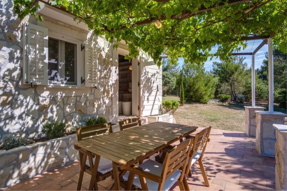 Jedinstvena prekrasna kamena kuca na osami 300 m od mora u uvali Zabodarski,s velikim mediteranskim vrtom od 1000 m2.Udaljenost od grada 10 km.Do kuce vodi odlican makadam 2 km.Solarna struja i grijanje vode.Priključak na vodenu mrezu,septička jama.Kuca je samostojeća,i samoodrživa!