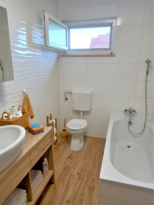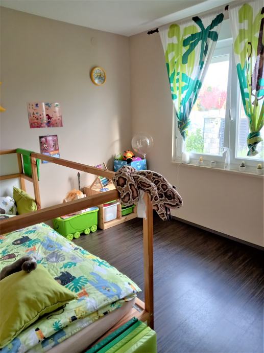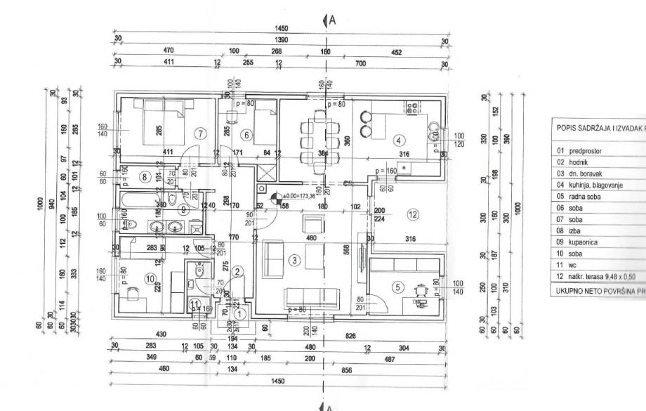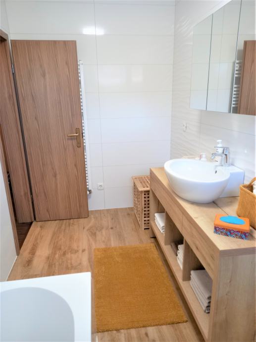 PROSTORIJE KUĆE: ulazni hodnik, dnevni boravak / blagavaona / kuhinja, spavaća soba, dječja i radna soba, dvije kupaone i prostorija sa plinskim protočnim bojlerom i perilicom rublja.