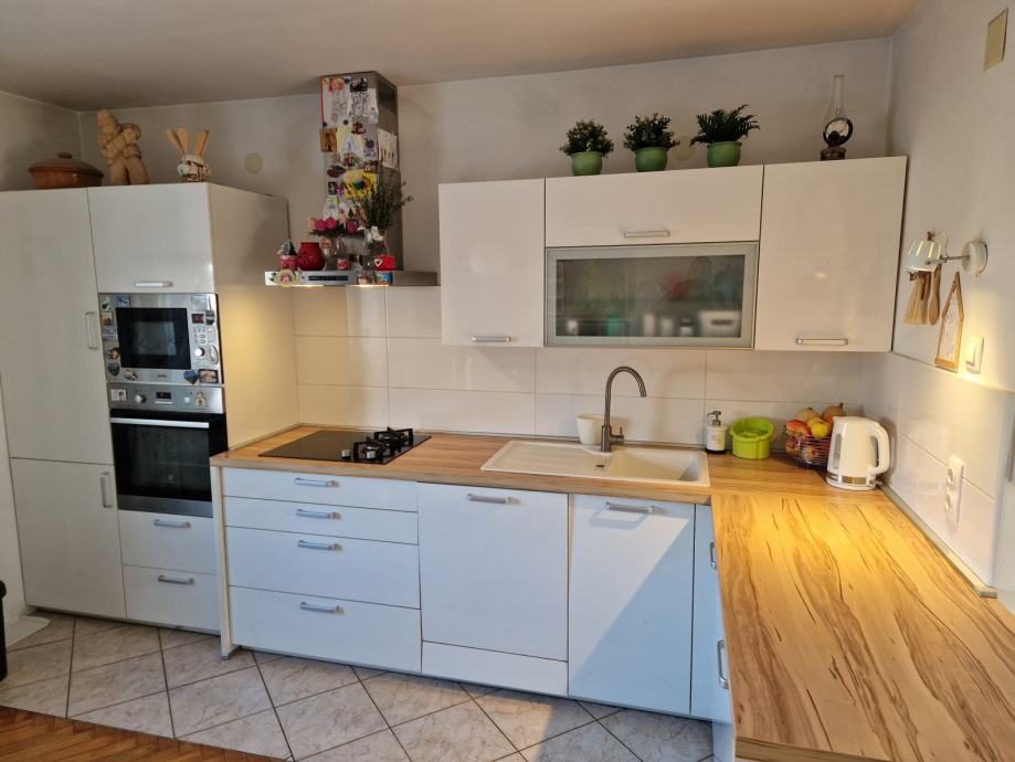 - kuhinja je Dan Kuchen, bijela visoki sjaj, radna ploha imitacija drva, svi aparati: pećnica, frižidrer, mikrovalna pećnica, štednjak 2x plin + 2x indukcija, perilica posuđa
