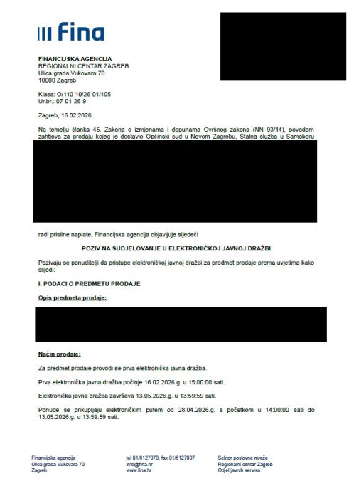 Prva elektronička javna dražba počinje 16.02.2026.g. u 15:00:00 sati.