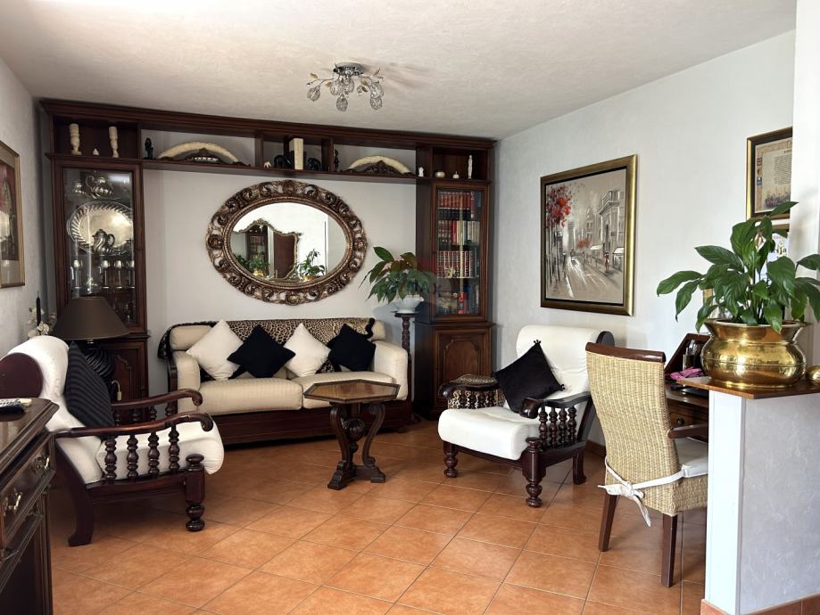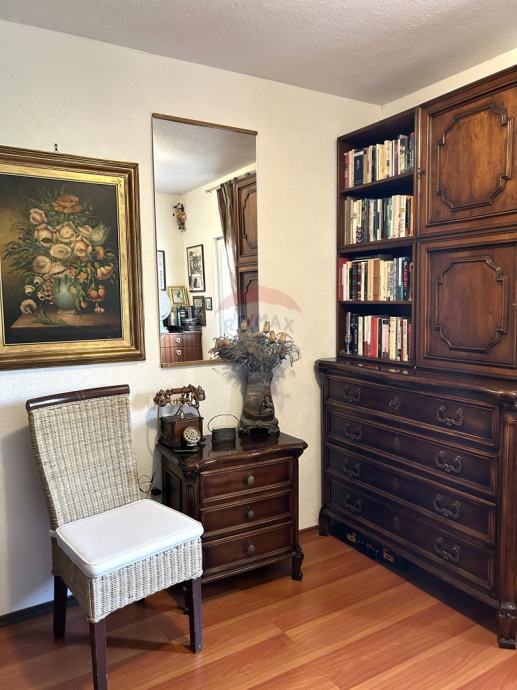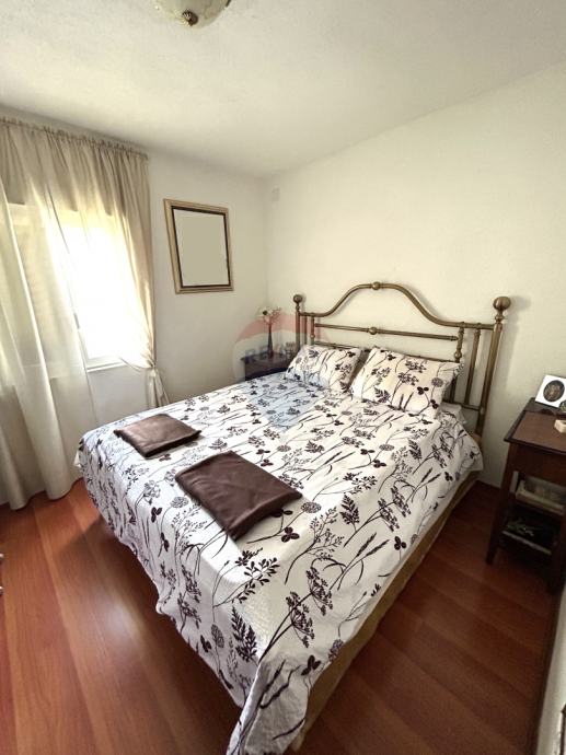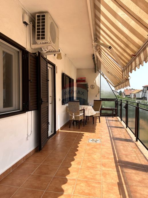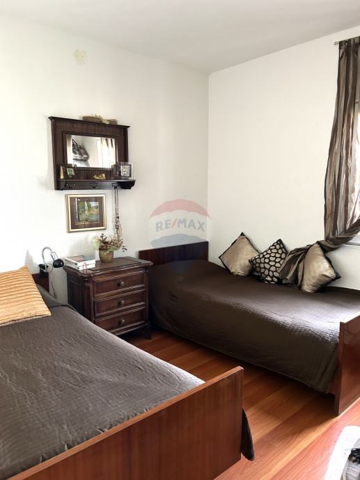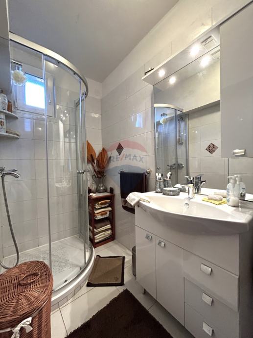 Vanjske stepenice vode na prvi kat na kojem se nalazi velika nenatkrivena terasa od 41,45 m2 te stan koji se sastoji od hodnika, tri spavaće sobe, kupaonice, wc-a, kuhinje, blagovaonice i dnevnog boravka te natkrivene terase na koju se izlazi iz dnevnog dijela.