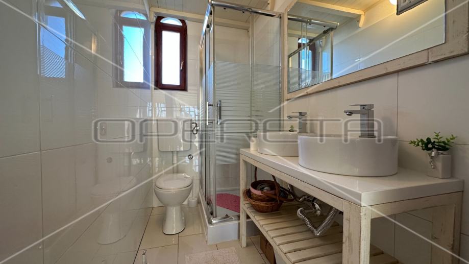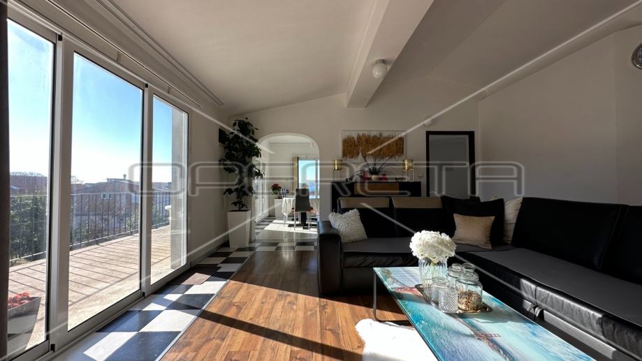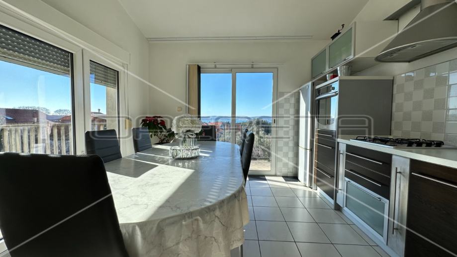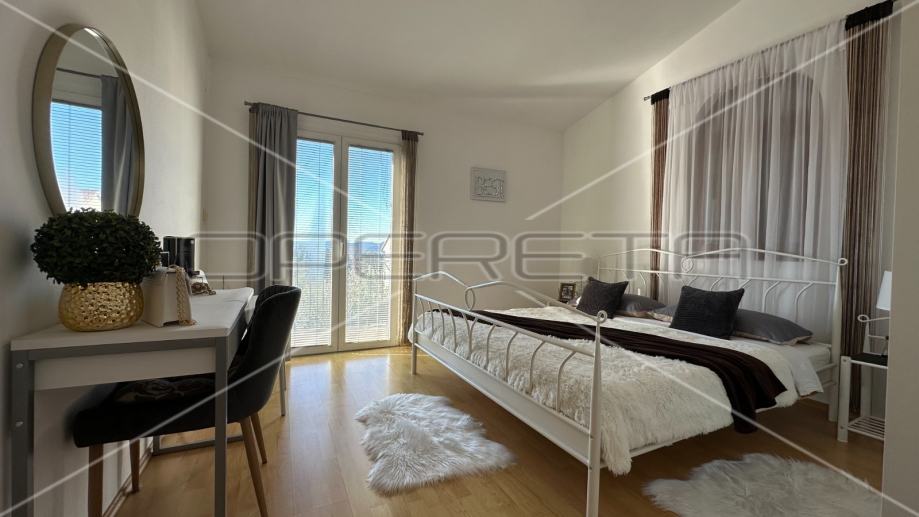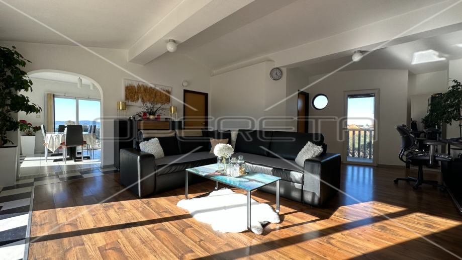 Na katu je također stan s 3 spavaće sobe, dnevnim boravkom, kuhinjom, 2 kupaonice s toaletom i velikom otvorenom terasom s predivnim pogledom na more. Stan ima više izlaza na terasu. Neto površina stana je 143 m2