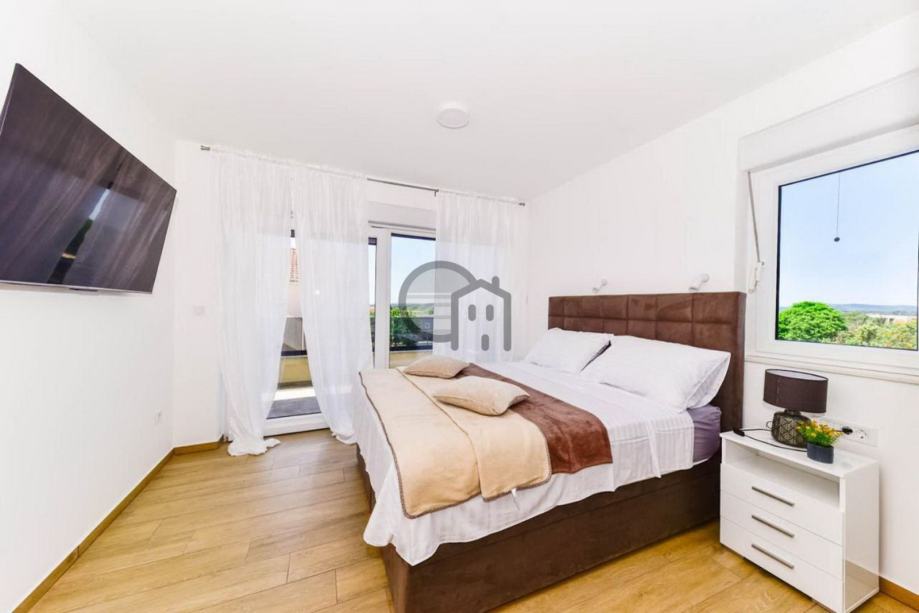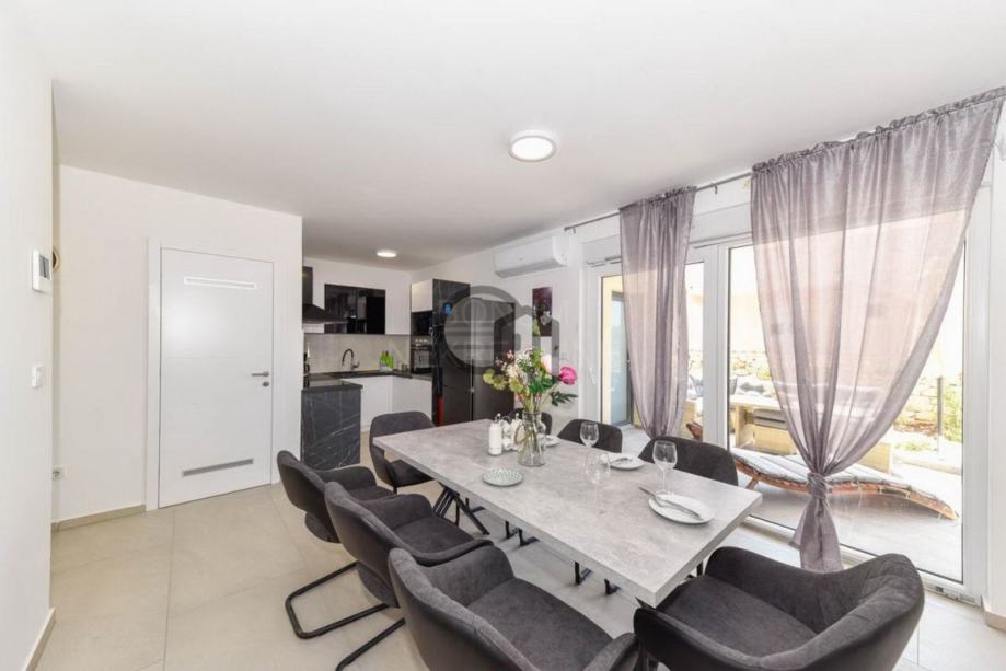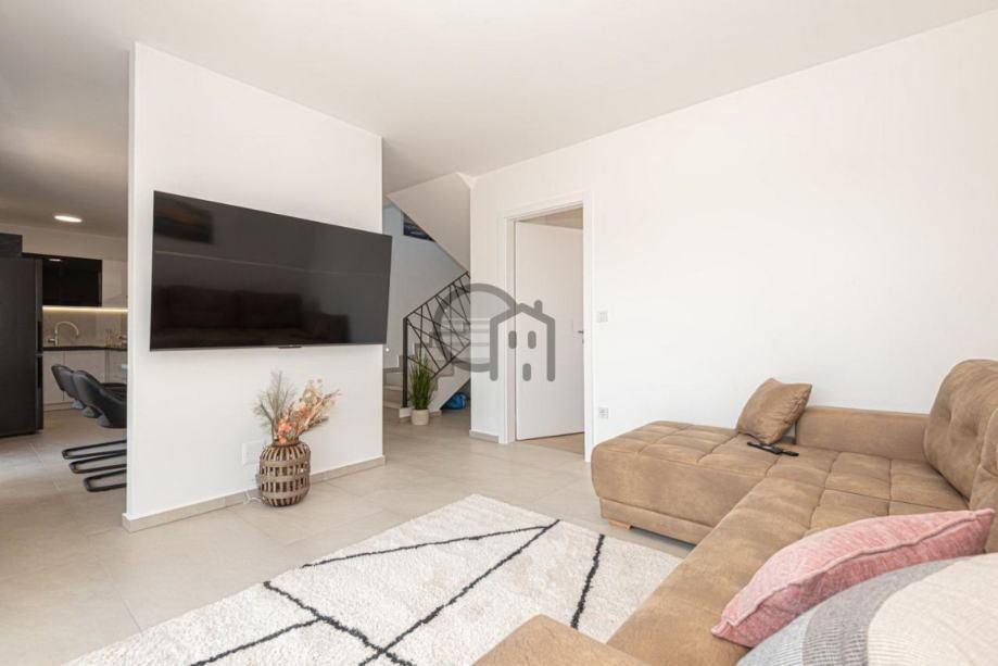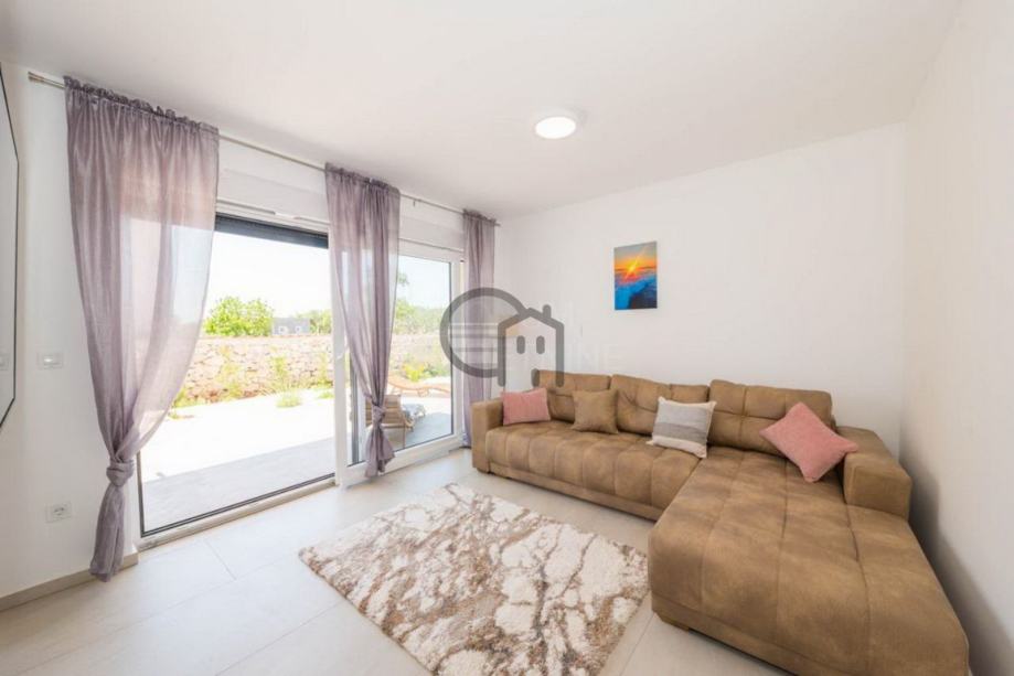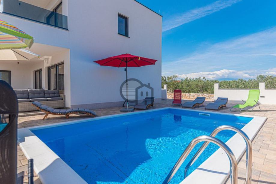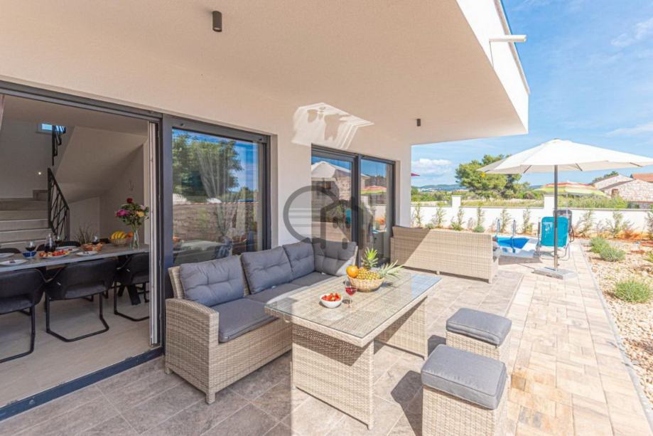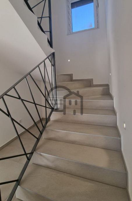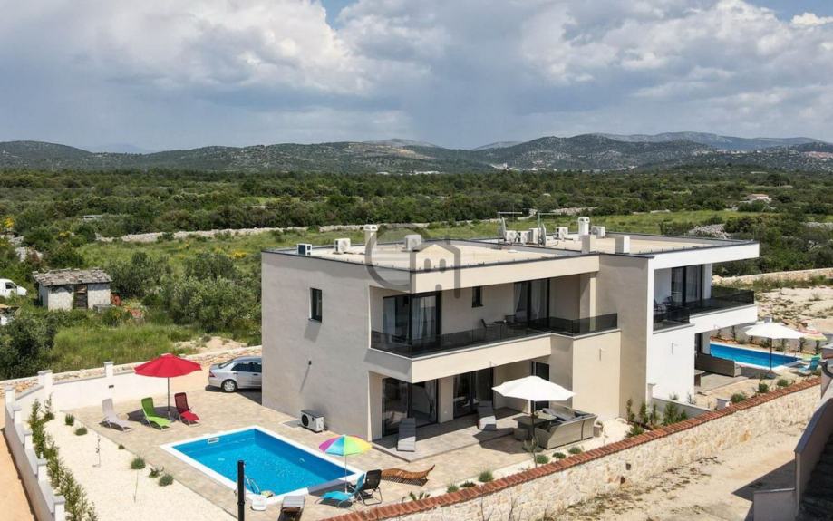 Prodaje se nova luksuzna kuća s bazenom na mirnoj lokaciji u Martinskoj pored Šibenika. Kuća je u naravi dvojni objekt i prostire se na dvije etaže: prizemlje i kat, dok u dvorišnom dijelu se nalazi lijepo uređena okućnica i bazen. Kuća ima odličan raspored prostorija te je projektirana na način da dvorišni dio svake kuće ima veliku okućnicu te potpunu intimu i privatnost. Svaki detalj ovih kuća je brižno osmišljen i dizajniran kako bi budući vlasnici imali potpuni luksuz i komfor za odmor ili stanovanje tijekom cijele godine. U prizemlju kuće se nalazi ulazni hodnik iz kojeg se dolazi do velikog dnevnog boravka otvorenog tipa s kuhinjom i blagovaonicom u jednoj cjelini iz kojeg se izlazi na natkrivenu terasu i dvorišni dio kuće koji s vanjske strane ima ljetnu kuhinju, zatim kupaonica, spremište i jedna spavaća soba. Unutrašnjim stepenicama se dolazi na kat kuće u kojem se nalaze još tri komforne spavaće sobe, od kojih jedna ima vlastitu kupaonicu i garderobni dio, zatim još jedna kupaonica. Iz spavaćih soba se izlazi na natkrivenu terasu 21,42 m2 dok nenatkriveni dio terase ima 3 m2. U dvorištu kuće dominira bazen i okućnica dok je s druge strane predviđen prostor za dva parkirna mjesta. Nekretnina predstavlja savršenstvo za kupce sa stilom koji žele luksuz te odmor i stanovanje na mirnoj lokaciji. Do Jadrije i lijepih plaža kuća je udaljena nekoliko minuta vožnje automobilom. Lokacija je odlično prometno povezana, nalazi se blizu autoputa dok je do aerodroma u Splitu ili Zadru udaljeno oko 50 minuta. Šibensko područje je jedno od najatraktivnijih turističkih destinacija i nalazi se u blizini dva nacionalna parka Krka i Kornati, poznato je po prekrasnim plažama, šetnicama, zatim brojnim kulturnim, zabavnim i sportskim sadržajima te bogatom gastronomskom ponudom.