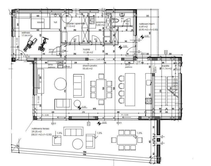 U prizemnom dijelu građevine nalazi se natkriveni trijem, hodnik, wc, praonica, prostor grijanja/spremište, wellness, dnevni prostor, prostor stubišta i natkrivena terasa.