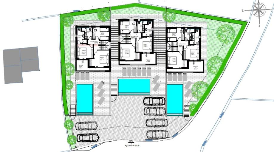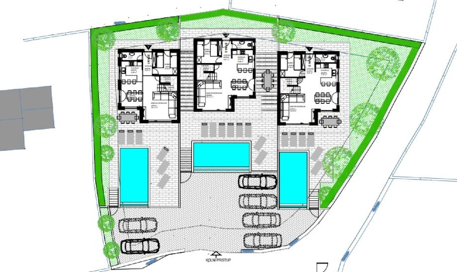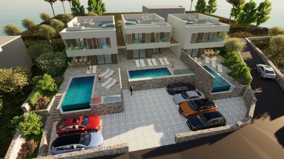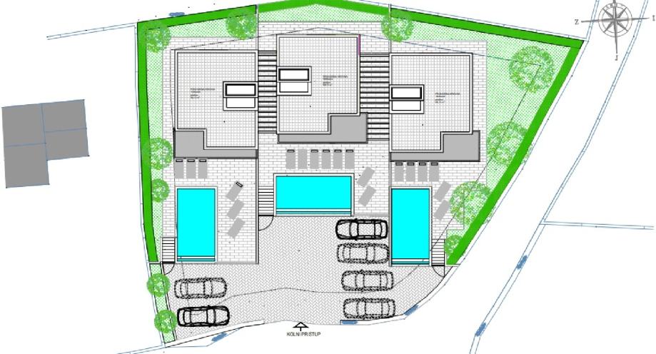 Projekt se sastoji od 3 vile s bazenom u nizu, na zemljistu od preko 1000m2 , svaka s svojim privatnim bazenom vrtom i parkingom.
