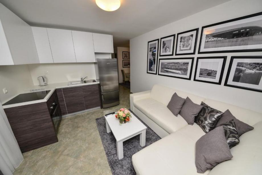 Prizemlje: stan sa tri spavaće sobe, dvije kupaonice, kuhinja sa blagovaonicom, dnevni boravak, teretana, igraonica i terasa.