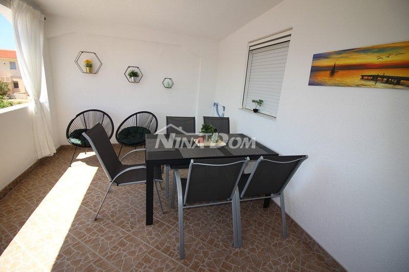 Kuća dvojnica koja se sastoji od tri stambene jedinice. Prizemlje posjeduje dvije spavaće sobe, kuhinju s dnevnim boravkom, hodnik, kupaonicu i terasu. Garaža 20 m2. Vanjske stepenice za kat i na katu dva odvojena apartmana koji svaki ima dvije spavaće sobe, kuhinju, kupaonu i terasu. Nekretnina je kompletno uređena. Udaljena je od mora i plaže svega 100 metara. Nalazi se u mirnoj i slijepoj ulici bez prevelike buke i gužve.