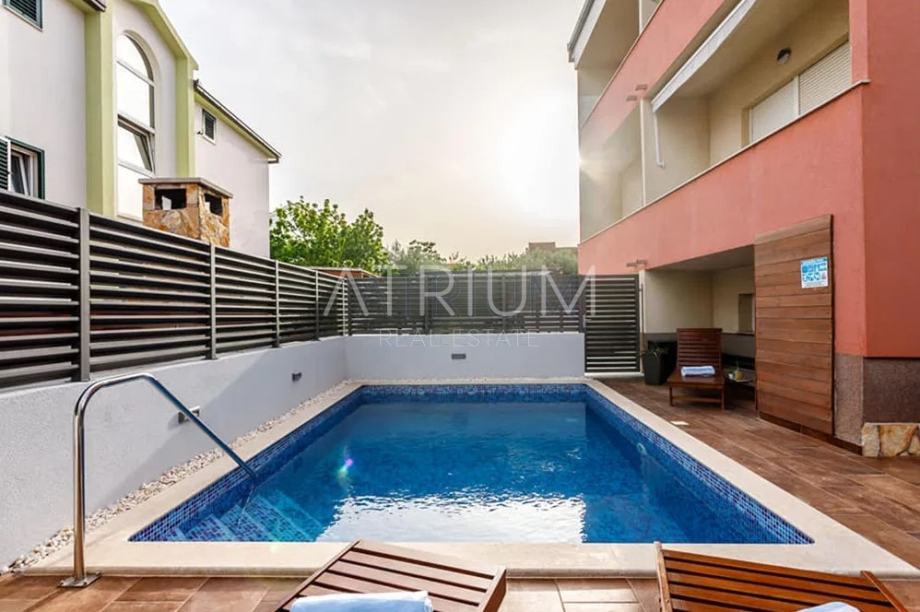 Stambena površina je 260m² + podrum koji je u suterenu s prozorima i dnevnom svjetlošću. Okućnica je 370m² i ima pet parkirnih mjesta. U vrtu je bazen od 25m², jacuzzi, 2 pergole s 2 kamina, a u podrumu je mini teretana sa stolnim nogometom i pikadom.