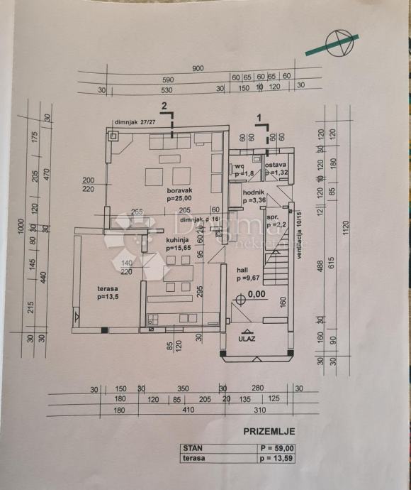 Tlocrtna površina prizemlja je 72,59 m2 te se nalazi na zemljištu površine 331 m2.