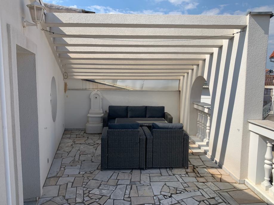 The center of this property is the spacious terrace on the top floor, which offers rest and a relaxing atmosphere in the hot summer months, as well as a beautiful view of the sea, the islands and the rooftops of the old town. The house has 133,51 m2 of gross developed area (with coefficients), and consists of 3 floors.